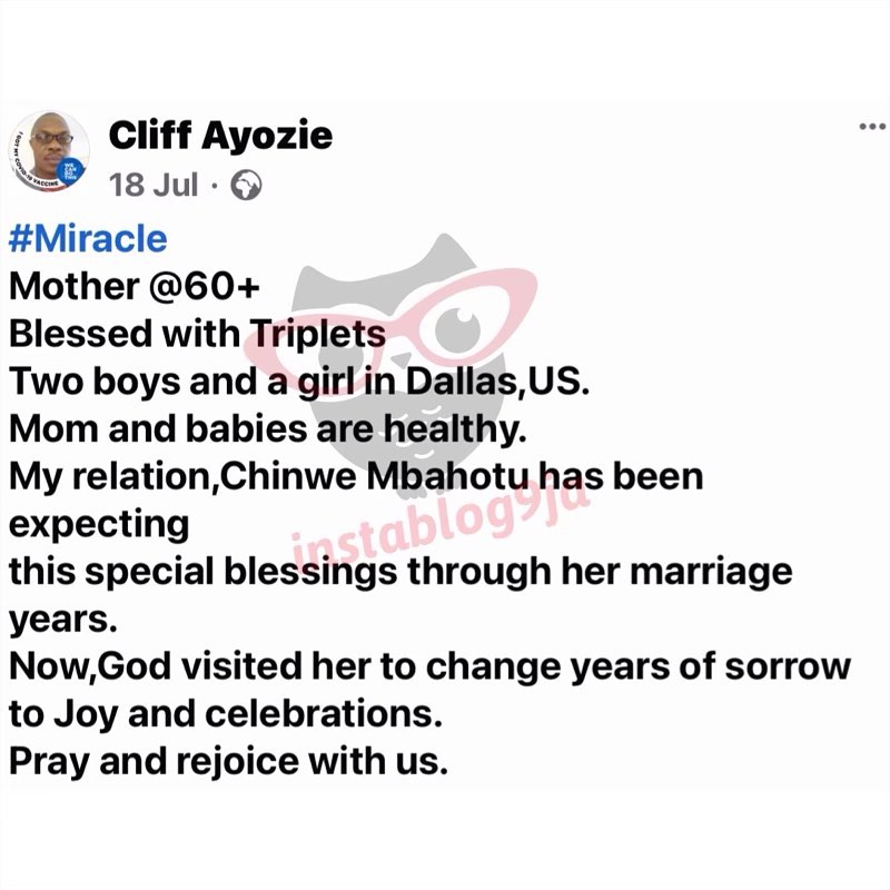 “Mother @60+ Blessed with triplets Two boys and a girl in Dallas,US. Mom and babies are healthy. My relation,Chinwe Mbahotu has been expecting this special blessings through her marriage years. Now,God visited her to change years of sorrow to Joy and celebrations. Pray and rejoice with us,” he posted.